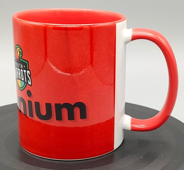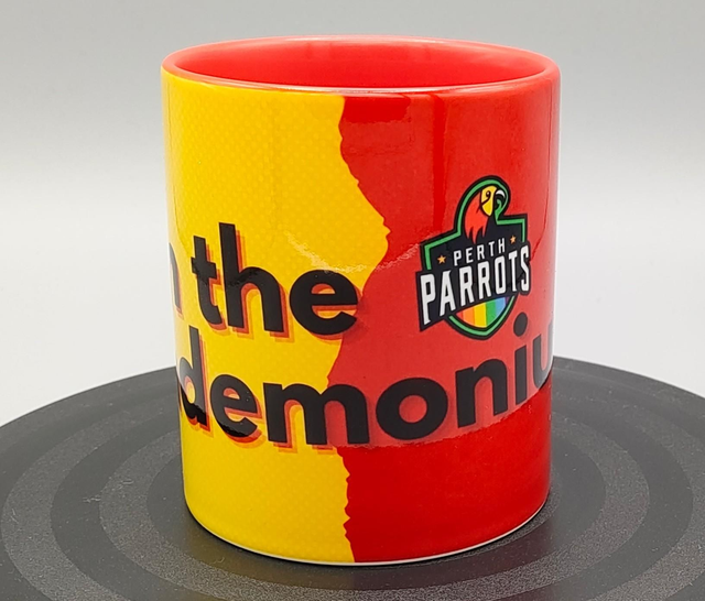 11oz Perth Parrots Branded Join The Pandemonium mug, with red handle and inside.