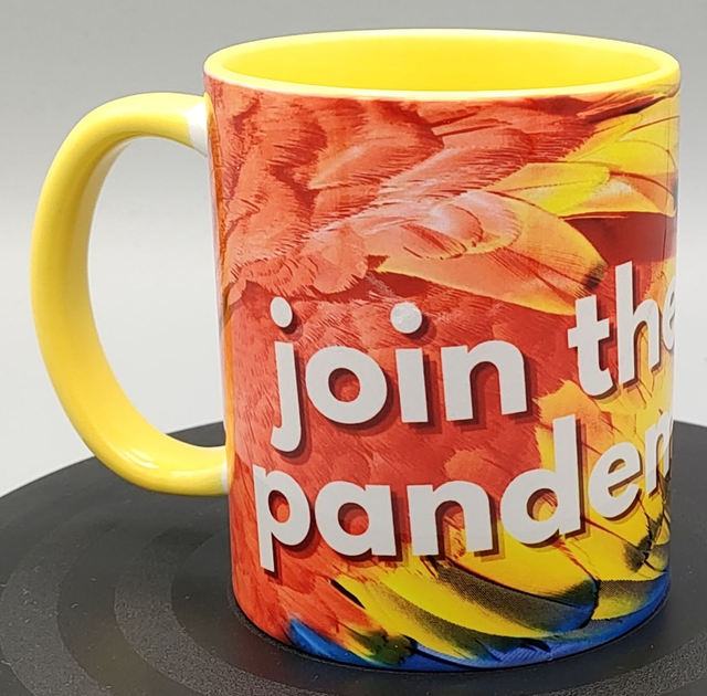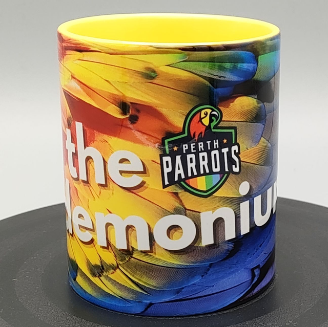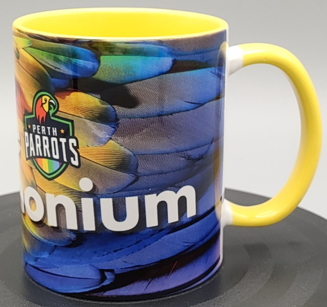 Perth Parrots Branded 12oz mug with Join The Pandemonium, decorated with colourful parrot feathers. The mug has a yellow handle and inside.