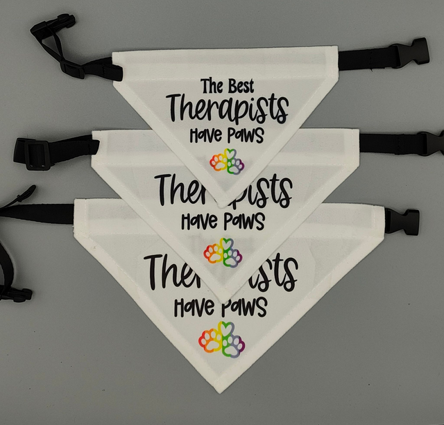 Cloth Pet Bandana available in 3 sizes, saying 'The Best Therapists Have Paws' with rainbow paws and heart on.